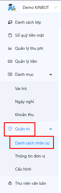 Bước 1: Vào menu Quản trị -> Danh sách nhân sự