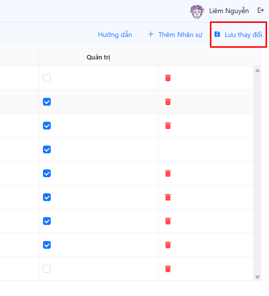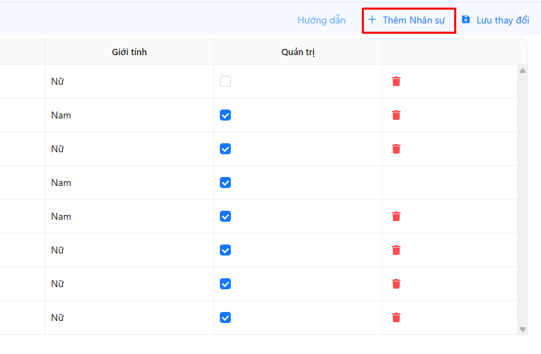- Nếu muốn xóa nhân sự thì bấm nút xóa (biểu tượng thùng rác màu đỏ).