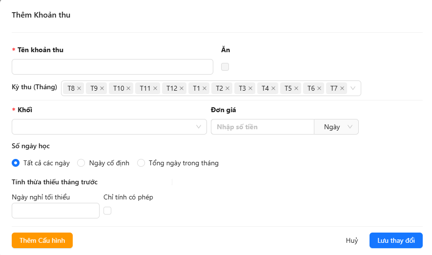 - Kỳ thu (tháng): Mặc định thu cả năm, Thầy/Cô chỉ cần xóa bớt những tháng không thu.