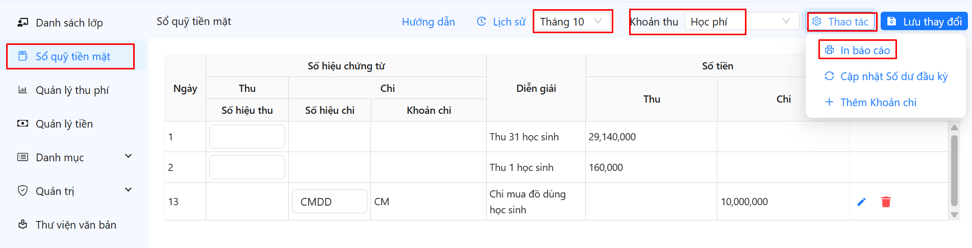 Bước 1: Vào menu Sổ quỹ tiền mặt -> bấm nút Thao tác -> In báo cáo -> chọn báo cáo cần in