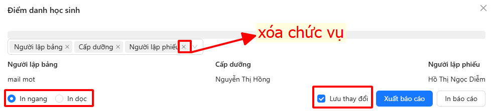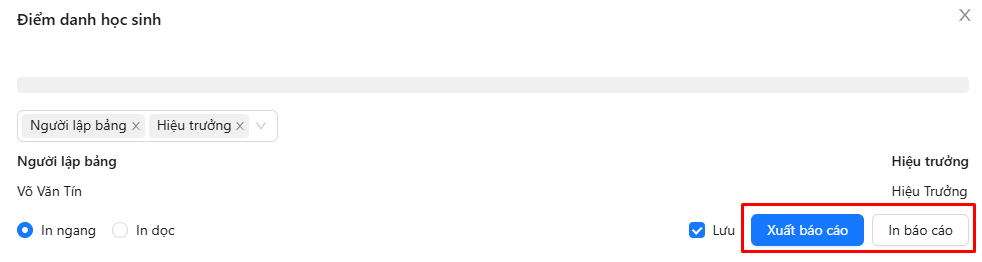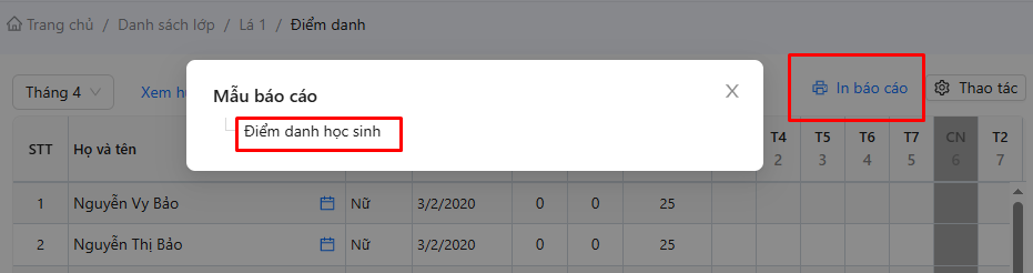 Bước 2: Chọn In báo cáo -> Chọn mẫu điểm danh học sinh